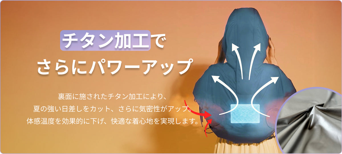 日差しを遮るUPF50+の特殊織物と背面の冷却パックで、真夏の外出やレジャーでも快適さが続きます。